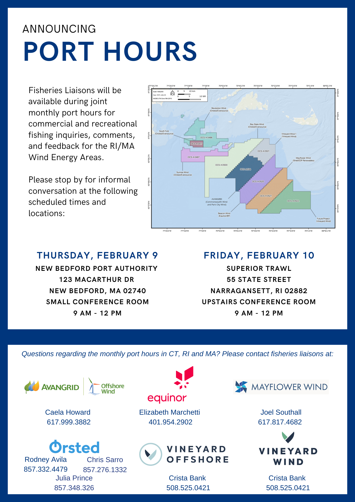 Fisheries Liaisons will be available during joint monthly port hours for commercial and recreational fishing inquiries, comments, and feedback for the RI/MA Wind Energy Areas.